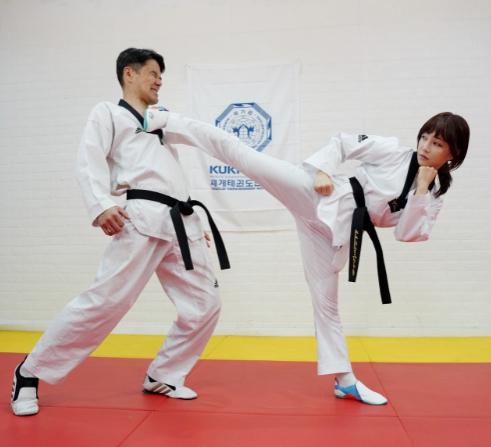 그는 국기원 공인 1단이다. 지난해 9월 수련을 시작,? 2월 단증을 받을 정도로 수련에 열심이다. "스케줄이 바쁘지 않을 때는 1주일에 5번이상, 하루 3~5시간 수련을 한다"며 "태권도 실전호신술은 지루할 틈이 없을 정도로 다양한 상황에 맞는 수련을 한다"고 말했다. 특히 여성태권도 수련 인구가 더 늘어야 한다고 덧붙였다.