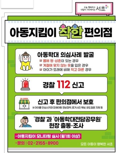 서울 서초구는 이달부터 지역내 24시간 운영 편의점 180여개를 ‘아동지킴이 착한 편의점’으로 지정하여 운영할 예정이다.