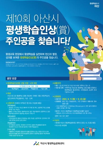 아산시가 모범 평생학습인을 발굴?시상하기 위한 ‘제10회 아산시 평생학습인상(賞)’ 후보자를 모집한다.