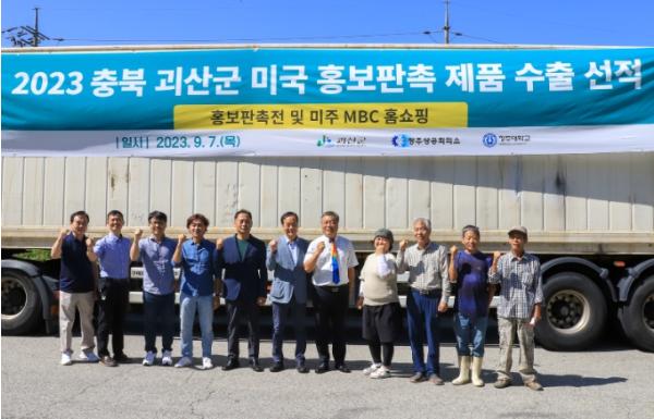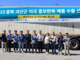 충북 괴산군은 지난 7일 문광면 미미식품 앞 광장에서 미국 농식품 판촉전 수출 물품 선적식을 개최했다.
