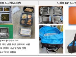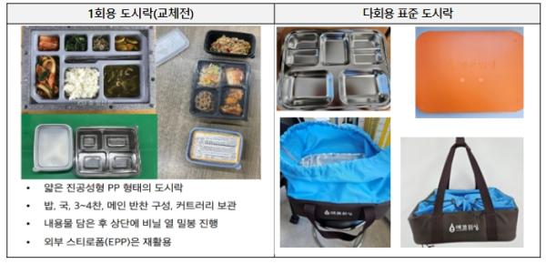 이번 사업에 쓰이는 다회용기 표준 도시락은 식판 형태의 스테인리스(탄소 저감 방식으로 생산된 강재)로 제작됐으며 별도의 받침에 올리고 뚜껑을 덮어 보온 가방에 담아 배송한다.