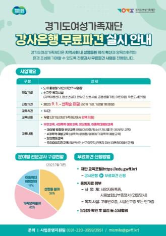 ‘전문 강사 무료 파견’ 사업은 경기도여성가족재단이 성평등 분야와 가족·보육 분야의 전문 강사로 구성된 강사은행을 통해 도내 교육이 필요한 곳에 무료로 파견하는 사업으로, 강사료는 전액 경기도여성가족재단이 부담한다.