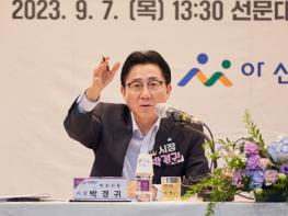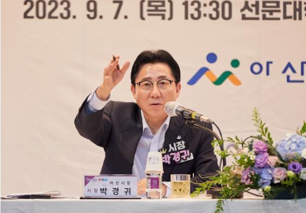 선문대학교 본관에서 진행된 이날 간담회는 박경귀 시장의 취임 후 탕정면에서 진행된 세 번째 공식 열린간담회로, 전남수 아산시의회 의원, 최창하 선문대 부총장, 기관·단체장, 일반 시민 등 100여 명이 참석했다.