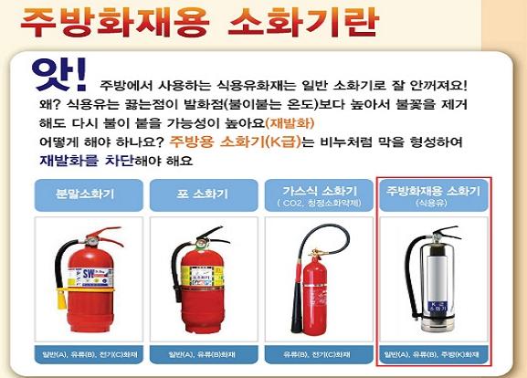 주방에서 주로 사용하는 식용유는 끓는점이 발화점보다 높아 분말소화기로 불꽃을 제거해도 재발화할 위험이 있어 주의가 필요하고 화재 진화 시에도 분말에 의한 소손 피해가 발생된다. 식용유 화재는 급격한 연소 확대로 많은 인명·재산 피해를 발생시켜 소방서는 K급 소화기 비치를 통한 예방 활동을 적극 권장하고 있다.