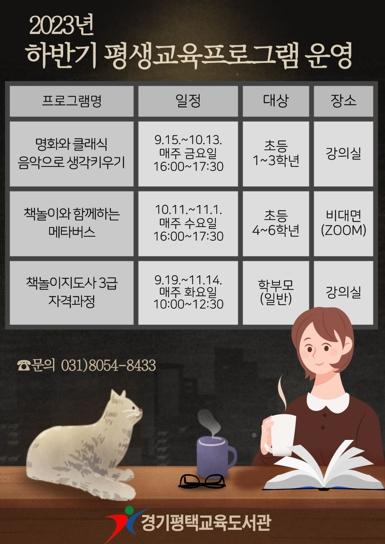 경기평택교육도서관이 9월 15일부터 11월 14일까지 ‘2023년 하반기 평생교육 프로그램’을 운영한다.