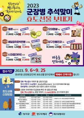 효도 선물 발송 희망자는 오는 25일까지 부대 내 군사우체국을 포함한 양구지역의 모든 우체국으로 전화, 팩스, 이메일 등의 방법으로 주문하면 된다.