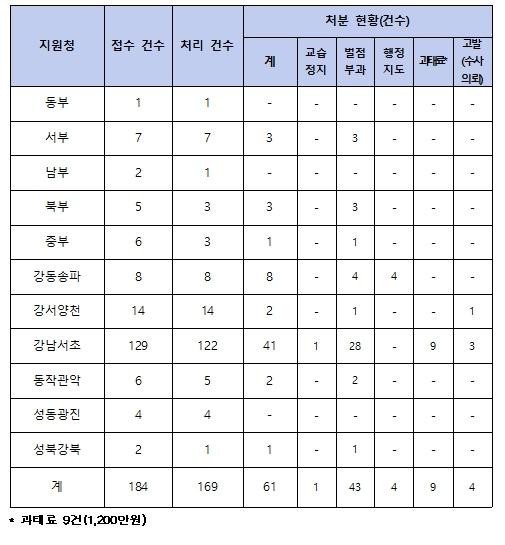 서울특별시교육청은 9월 5일 기준 사교육 카르텔·부조리 신고센터에 접수된 184건 중 169건을 처리했다고 밝혔다. 169건은 교육부의 사교육 카르텔·부조리 신고센터 설치('23.6.22.) 이후 최근까지 처리된 건수로 행정처분을 61건 실시했으며, 기간 중 교육부와 합동점검도 10회 실시했다.