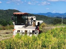 보은군에서 가을의 시작을 알리는 첫 벼 수확이 시작되면서 집중호우와 폭염을 극복하고 수확의 기쁨을 만끽하고 있다.