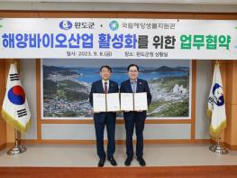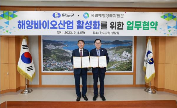 완도군은 국립해양생물자원관과 9월 8일 해양바이오산업 발전을 위한 업무 협약을 체결했다.