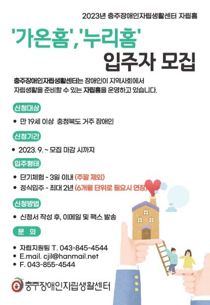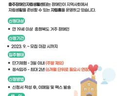 충주장애인자립생활센터가 충주시 내 또는 충청북도 내 시설 및 지역 장애인을 대상으로 자립홈 입주자를 모집한다.