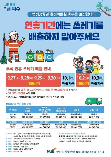 파주시는 환경미화원이 휴무를 보장하기 위해 추석 연휴 기간(9.28.~10.1.)과 개천절(10.3.)에는 생활 쓰레기를 수거하지 않는다고 밝혔다.