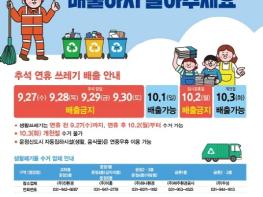 심재우 자원순환과장은 “추석 연휴 기간 쓰레기 수거 중단으로 시민분들의 불편이 크겠지만 배려의 마음으로 적극적인 참여를 부탁드린다”라고 말했다.
