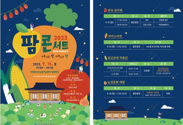 인천시 농업기술센터 열린광장에서 9월 16일 오후 5시부터 8시 30분까지 진행되며, 한옥 음악회, 파머스마켓, 전통놀이 체험 등을 운영해 다양한 볼거리와 즐길거리를 제공할 예정이다.