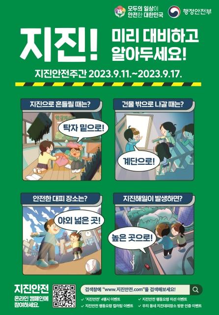 홍성군은 2023년 지진안전주간을 맞아 지진 발생 시 군민이 당황하지 않고 안전하게 대처할 수 있도록 지진 행동요령을 적극 홍보한다고 밝혔다.