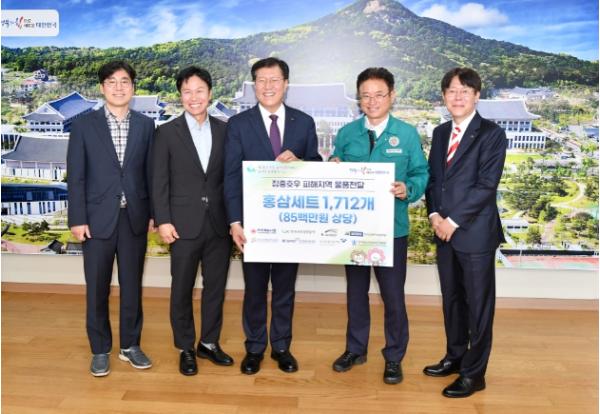 이번 물품 전달식에서는 해당 기관에서 출연한 농어촌 상생협력기금(8천5백만원 상당)을 활용해 집중호우로 큰 아픔을 겪은 피해지역 이주민들이 일상으로 복귀하는 데에 조금이나마 도움이 될 수 있도록 도내에서 생산된 홍삼정과를 전달했다.