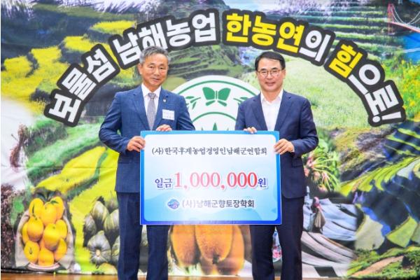 (사)한국후계농업경영인 남해군연합회는 지난 6일 제36회 남해군후계농업경영인 가족한마음대회를 기념해 향토장학금 100만원을 기탁했다.