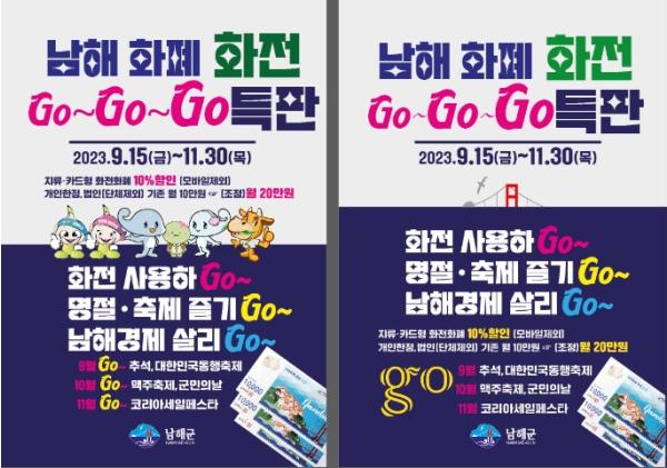 남해군은 9월15일 금요일부터 11월30일까지 ‘화전 사용하Go~ 명절·축제 즐기Go~ 남해경제 살리Go~’란 테마로 남해화폐 화전(花錢) 특별판매를 실시한다고 밝혔다.