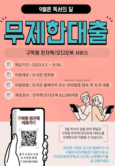 충주시립도서관은 9월 독서의 달을 맞아 구독형 전자책(오디오북) 대출 권수를 무제한으로 운영하는 서비스 이벤트를 실시한다.