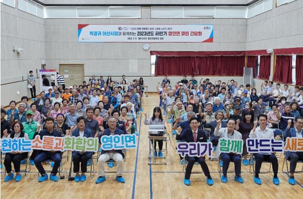 영인초등학교 강당에서 진행된 이날 간담회는 박경귀 시장의 취임 후 영인면에서 진행된 세 번째 공식 간담회로, 김희영 아산시의회 의장을 비롯해 기관·단체장과 일반 시민 등 200여 명이 참석했다.