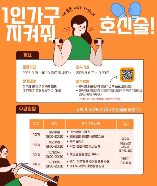 상주시 가족센터는 1인 가구의 건강한 안전망 구축과 비상 상황 시 대비 능력을 향상해 스스로를 보호할 수 있도록 호신술 교육을 진행한다. 이번 프로그램은 태권도를 활용한 호신술 교육으로 9월 20일까지 모집한다.