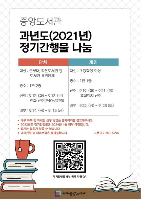 개인은 초등학생 이상을 대상으로 9월 19일부터 21일까지 선착순으로 온라인 신청을 받고, 22일부터 23일까지 배부를 진행한다. 1인 1종 신청 가능하며, 배부 확정 안내 사항은 신청 후 문자로 발송될 예정이다. 자세한 신청 방법 및 정기간행물 목록 확인은 중앙도서관 누리집 공지사항을 통해서 확인할 수 있다.