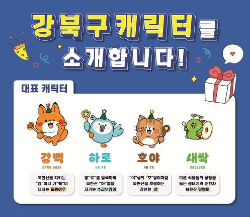 이순희 강북구청장은 “강북구 상징하는 대표캐릭터를 활용해 구민들에게 유익한 구정소식을 적극적으로 알리고 온·오프 현장에서 활발하게 소통하겠다”며 “강북구를 상징하는 대표캐릭터 ‘강백·하로·호야·새싹’이를 많이 사랑해달라”고 말했다.