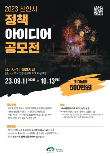 천안시는 시민의 창의적인 아이디어를 발굴하고 시정에 반영하기 위해 ‘2023 하반기 천안시 정책 아이디어 공모전’을 시행한다고 13일 밝혔다.