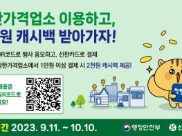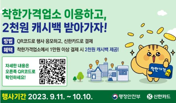 이번 행사는 행정안전부가 착한가격업소 이용 활성화를 위해 신한카드사와 협업을 맺고 착한가격업소에서 신한카드로 1만원 이상 결제 시 2천원을 캐시백으로 받아 갈 수 있으며 행사기간인 9월 11일부터 10월 10일까지 최대 1만원을 지급 받을 수 있다.