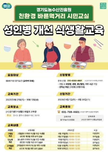 경기도농수산진흥원은 경기도 친환경 농산물의 인식 확산과 건강한 식생활의 가치 전파를 위한 ‘성인병 개선 식생활 교육’을 21일부터 (사)경기광주식생활교육협회 교육장에서 운영한다.