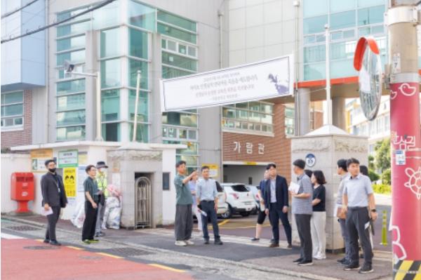 이번 통학로 현장점검은 구청장, 지역구 의원, 학교운영위원장, 교통?도시관리?건설?건축 분야 부서장이 가람중학교를 비롯한 4개 초?중학교 통학로와 학교 주변을 확인하고 점검했다.