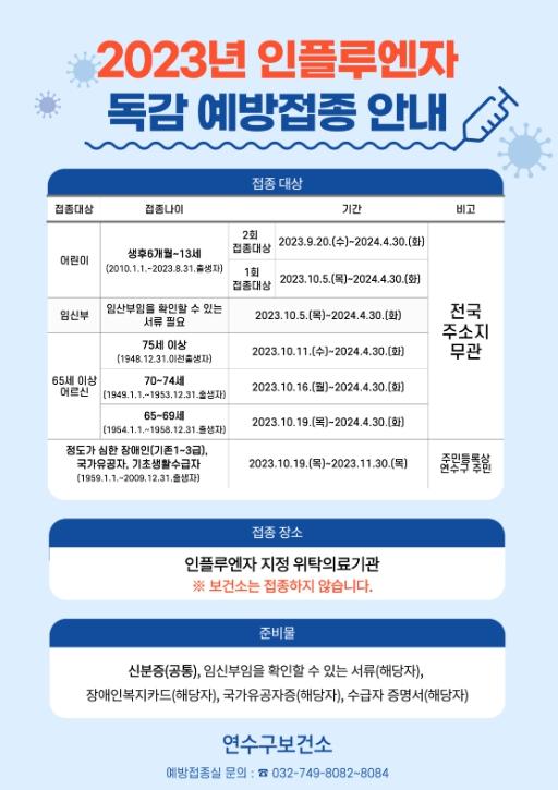 인천시 연수구가 오는 20일부터 겨울 인플루엔자(독감) 예방을 위해 생후 6개월에서 13세까지 어린이를 시작으로 인플루엔자 무료 예방접종을 실시한다.