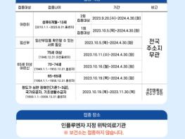 날짜별로는 ▲9월20일~2024년 4월30일=독감 백신 2회 접종 대상자(독감 주사를 처음 맞는 생후 6개월~8세) ▲10월5일~2024년 4월30일=독감백신 1회 접종 대상자(13세까지 어린이), 임신부 등이다.
