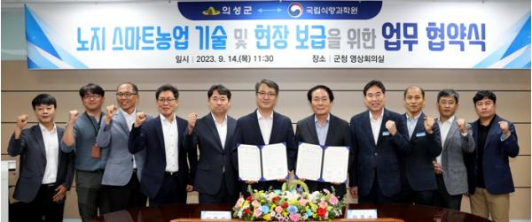 의성군이 노지 스마트농업 분야에서의 혁신과 발전을 위하여 국립식량과학원과 업무협약(MOU)을 체결했다.
