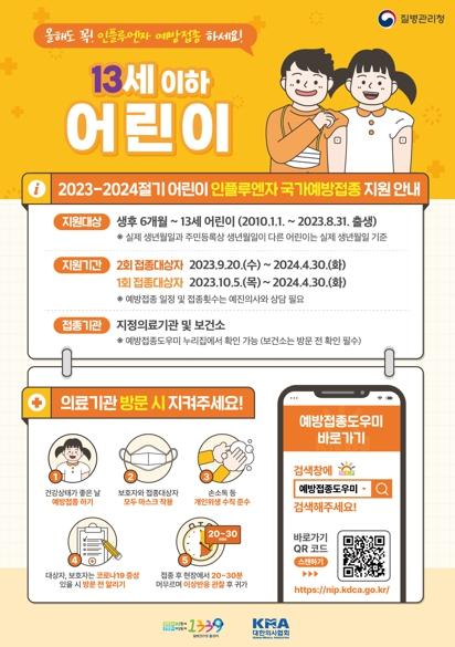 예방접종은 △9월 20일 2회 접종이 필요한 어린이부터 시작 △1회 접종 어린이와 임신부는 10월 5일 △75세 이상은 10월 11일 △70~74세는 10월 16일 △65~69세는 10월 19일부터 순차적으로 진행한다.