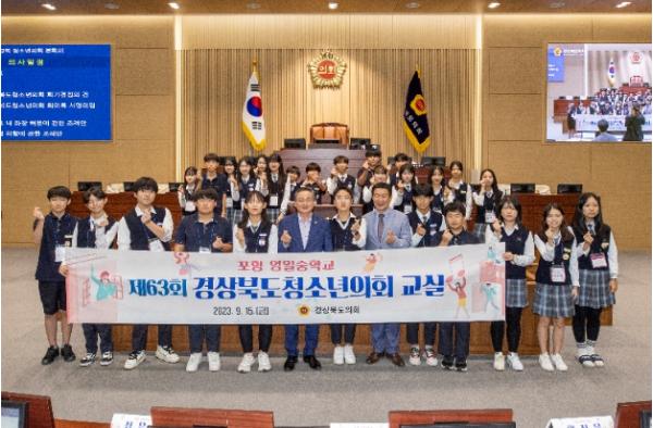 경상북도의회는 9월 15일 경상북도의회 본회의장에서 열린 제63회 경상북도의회 청소년의회교실에 포항 영일중학교 학생들과 함께하며 지방의회의 역할에 대한 안내와 체험활동을 같이 펼쳤다.
