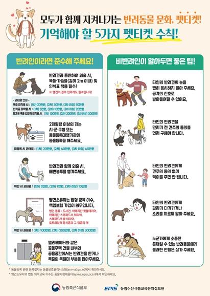안재완 동물방역과장은 “추석 연휴 기간 동안 동행캠페인을 통해 반려동물 소유자등의 의무사항과 반려인-비반려인이 어울리는 생활 속 반려동물 공공예절을 준수하여 줄 것”을 당부하며, 앞으로도 사람과 동물이 함께 행복한 강원특별자치도 실현에 최선을 다하겠다”고 밝혔다.