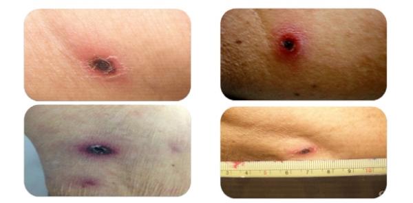 털진드기에 물렸을 때는 검은 딱지(가피)가 형성되고, 특히 습한부위인 복부, 가슴, 겨드랑이, 사타구니, 종아리 등에서 많이 발견되므로농작업 후 반드시 몸을 꼼꼼히 살펴봐야 한다.
