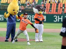 김 지사 시구에 대한 시타는 대백제전 마스코트 ‘금이’가 진행했다.