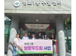강덕식 천호1동장, 복지담당 공무원, 방문간호사 3인 체제로 운영하는 ‘방문두드림’은 매주 목요일 고시원, 지층 등에 거주하는 주거취약 1인가구 대상자 2가구를 방문하여 건강상태, 사회적관계망 형성 등을 종합적으로 파악하고 수요자의 욕구에 맞는 복지서비스를 연계하는 특화사업이다.