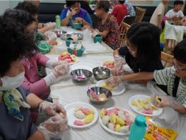 돌봄센터 아이 1~2명과 어르신 한 명이 짝을 이뤘다. 송편도 사 먹는 게 익숙한 아이들은 직접 만드는 일이 신기하기만 하다. 아이들이 작은 손으로 반죽을 동그랗게 만들어 안에 원하는 소를 넣는다. 아이들은 난생처음 하는 일이라 서툴기만 하다. 경험 많은 할머니, 할아버지가 힘을 보태 하나, 하나 완성한다. 익반죽에 소를 넣어 모양을 다듬은 뒤 참기름을 묻혀 붙지 않도록 하면 알록달록 송편이 완성된다.