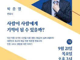 박준영 변호사는 이번 강연에서 익산 약촌 오거리 택시기사 살인사건, 무기수 김신혜 친부 살인사건 등 종결된 사건의 재심결정을 이끈 사례와 돈이 되지 않는 재심 변호로 파산하면서도 끝까지 포기하지 않았던 삶에 대한 의지, 인간의 존엄성에 관한 이야기를 펼치며 시민들에게 희망과 용기의 메시지를 전할 예정이다.