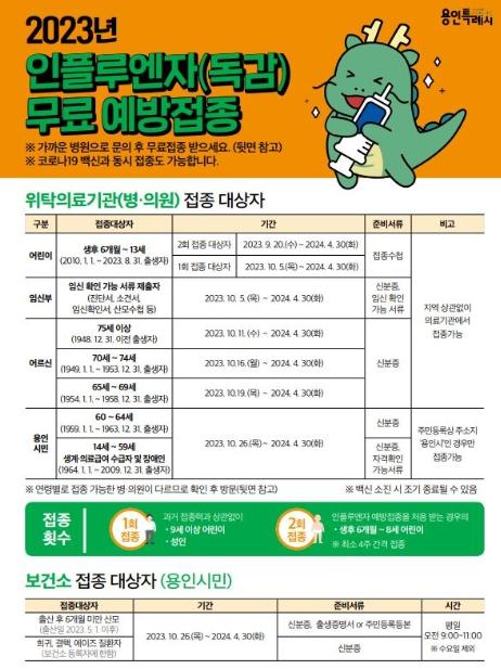 국가예방접종 대상자는 주소지와 상관없이 전국 지정 위탁의료기관에서 무료로 접종을 받을 수 있고, 시에서 지원하는 대상자는 관내 보건소와 지정의료기관 368개소(처인 85개소, 기흥 151개소, 수지 132개소)에서 접종을 받으면 된다.