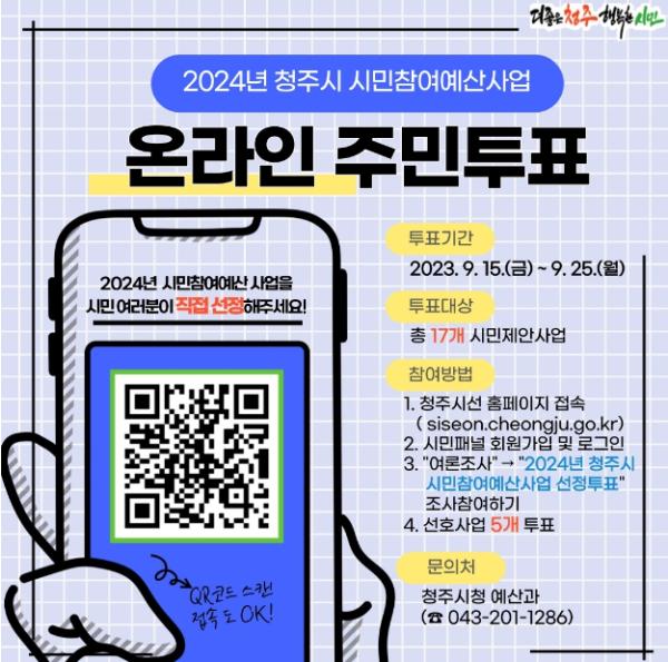 온라인 투표는 만 14세 이상 청주시민이면 누구나 참여할 수 있다. 청주시선 홈페이지에서 시민패널로 가입한 뒤 17개 사업 중 5개의 선호사업에 투표하면 된다. 투표는 오는 9월 25일까지 진행한다.