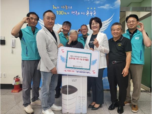 제천시 이통장연합회장와 kt 제천지점 사랑의 봉사단이 협업으로 18일 지역의 취약계층 대상자에게 공기청정기 4대(240만원 상당) 기부 및 전달식을 가졌다.