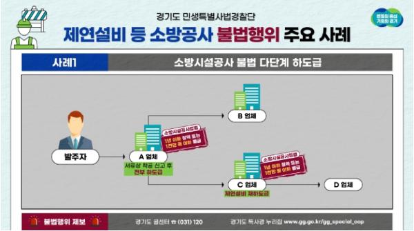 주요 사례를 보면 남양주에 위치한 복합건축물 신축공사를 도급받은 A는 무선통신보조설비를 직접 시공할 것처럼 신고하고 소방전기업체 B에 하도급을 줬다. 같은 현장에서 A로부터 하도급받은 소방기계공사업체 C는 제연설비 공사 전체를 D에게 재하도급하다 적발됐다.