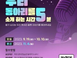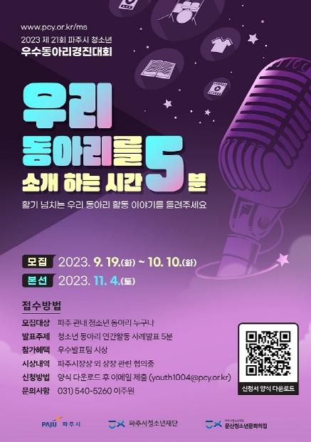 파주시와 (재)파주시청소년재단 문산청소년문화의집은 10월 10일까지 ‘제21회 파주시 청소년 우수동아리 경진대회(부제: 우리 동아리를 소개하는 시간 5분)’에 참가할 관내 청소년동아리를 모집한다.