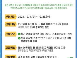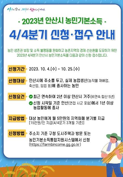 요건을 충족한 농민에게는 3개월분(10~12월)인 15만원(월 5만원)을 안산 지역화폐 다온으로 지급한다.