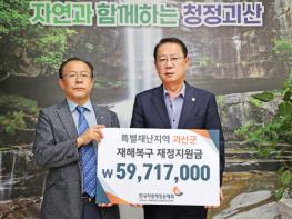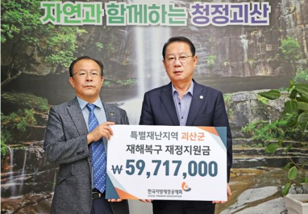 충북 괴산군은 지난 18일 행정안전부 산하 지방재정 전문기관인 한국지방재정공제회로부터 특별재난지역 재해복구 재정지원금 5천9백여만 원을 전달받았다.