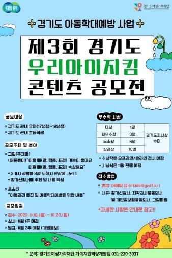 경기도가 10월 23일까지 아동학대예방에 대한 도민 관심 유도와 사회적 책임 의식 확산을 위해 ‘2023년 제3회 우리아이지킴 콘텐츠 공모전’을 개최한다.