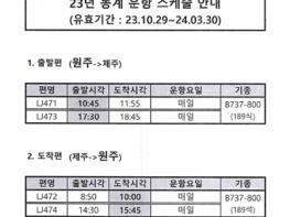 원주공항에 취항하고 있는 진에어는 최근 동계 항공기 운항 일정을 확정했고, 이에 따라 원주~제주 노선의 운항시간이 조정됐다.